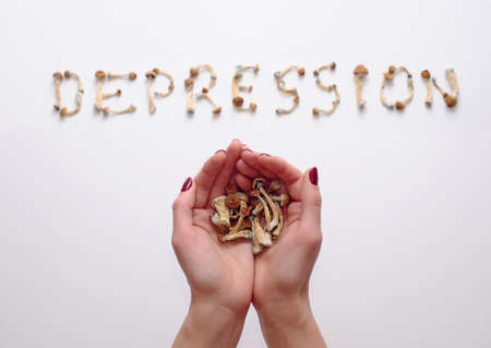 Microdosing concept. Dry psilocybin mushrooms on white background. Remedy of depression. Scientific research. Psychedelic effect. Medical use.