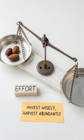 Antique balance scales meticulously weigh a word block labeled 'Effort' against a pile of nuts, representing the critical balance between input and reward, perfect for illustrating investment decisions and strategic planning.