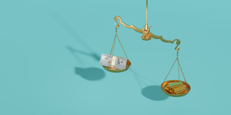 A golden balance scale with cash on one side and gold bars on the other, symbolizing financial value, wealth, and investment choices.