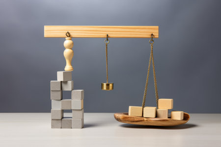 A simple balance scale made from wooden blocks and a popsicle stick on white, symbolizing equilibrium, decision-making, and fairness.