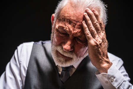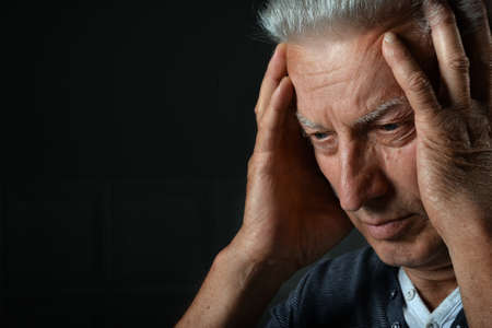 Portrait of depressed senior man on black background.