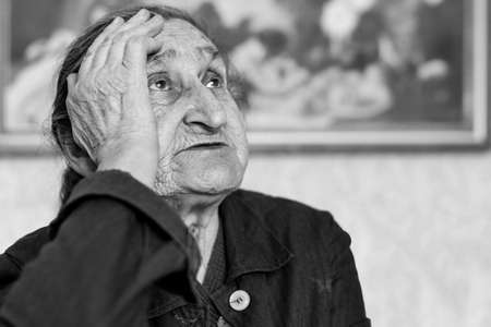 Black-and-white portrait of an elderly woman emotional says in her home.