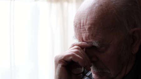 Senior retiree has severe migraine attack. Exhausted elderly man suffering from headache