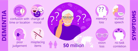 Dementia infographic concept vector, neurology health care, Parkinson s or Alzheimer s disease metaphor are shown. Symptoms of dementia of old man is presented. National awareness month.