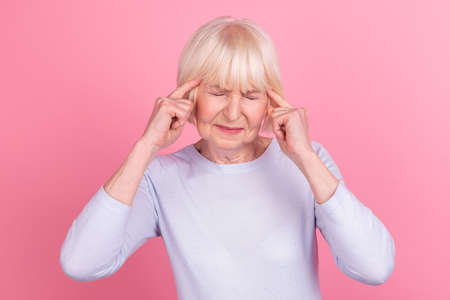 Photo of mature woman hands touch head migraine unhealthy corona virus isolated over pink color background