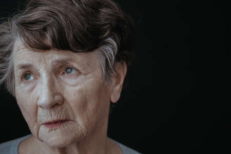 Sad, old woman wearing eyeglasses, black background