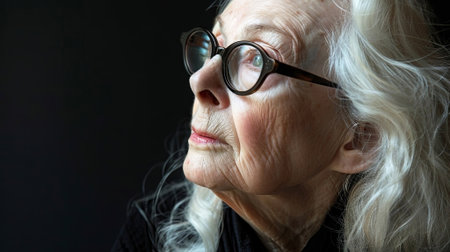 Close up portrait of an elderly woman wearing glasses, highlighting wrinkles and aging skin, potentially suitable for themes of cosmetology, skincare, or aging