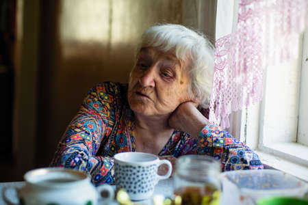Sad lonely old gray haired woman looking through the window. Vulnerable person in quarantine. High quality photo