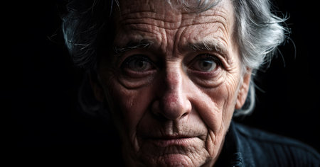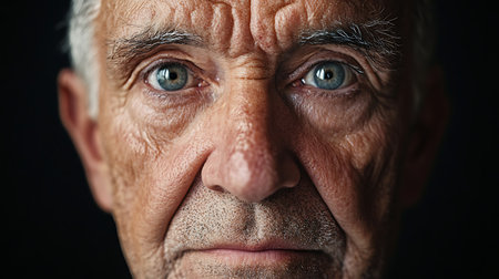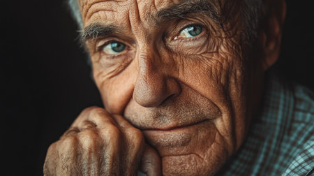 The intricate lines on an elderly mans face are highlighted by stark contrast, telling tales of resilience. His eyes hold a powerful, emotive energy.