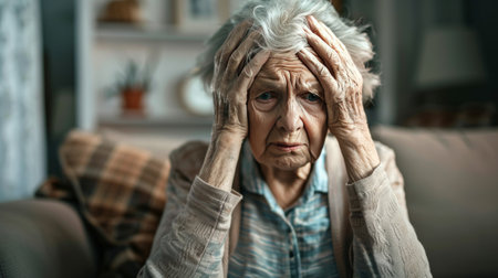 An elderly woman sits looking confused with her head in her hands.