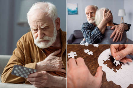collage of senior man feeling bad and holding pills, man hugging wife sick on dementia, and woman collecting jigsaw puzzle