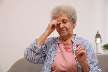 Senior woman with headache sitting on sofa at home
