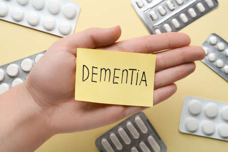 Woman holding paper note with word Dementia over beige background, top view