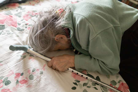 Old woman. Portrait of very old tired woman in depression lies on bed with her face buried in a pillowcase