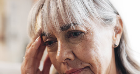 Senior, woman and thinking with headache in home for retirement debt, decision mistake and pressure. Elderly person, face and tension migraine with pension stress, overwhelmed and financial crisis