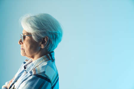 Profile of elderly wrinkled caucasian lady sadly gazing into infinity, medium close up studio shot with blue background. High quality photo