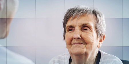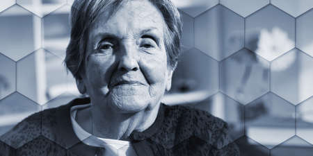 Portrait of elderly woman looking out the window and dreaming, geometric pattern