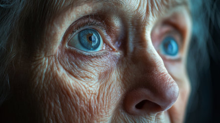 This image presents a detailed closeup of an elderly woman's face, showcasing her striking blue eyes and the beauty of age