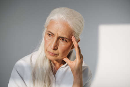 Medium studio shot of elderly gray-haired caucasian lady wearing flannel shirt and sadly looking away. High quality photo