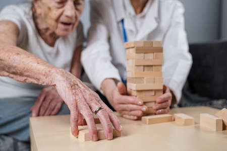 Senior woman practice skills, build wooden blocks, build tower and try not to let it fall, game. Old patient pull out block, place on top, support doctor during therapy dementia in house.