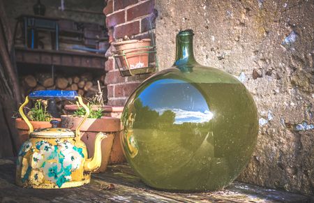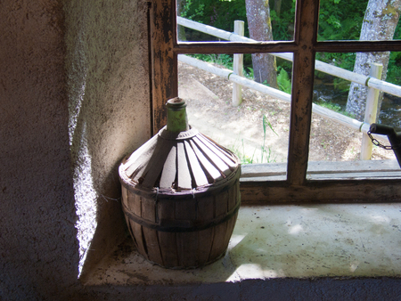 Empty carboy in rustic house, leaning against the wall