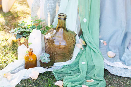 Floral arrangement to decorate the wedding party. Flowers, candles, a bottles outdoors. The vintage
