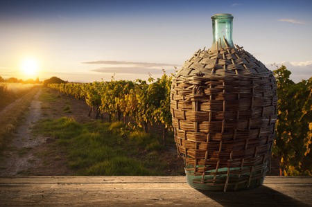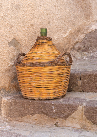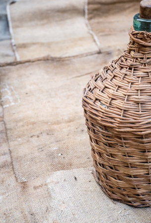 old straw-covered demijohn with aged red wine
