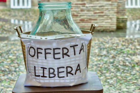 Demijohn of glass with Italian writing meaning make a donation, that is Offer as much or as little as you wish
