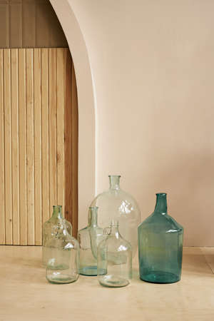 Demijohn vase with eucalyptus branches. Decorative glass vase. Interior and object photography