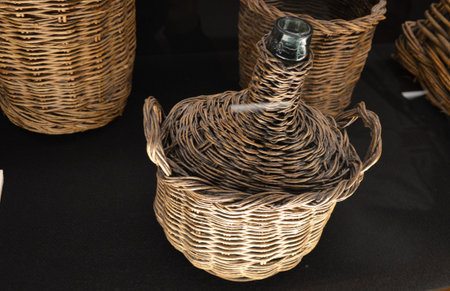 bottles, wine jugs, jars braided with rattan wood vine