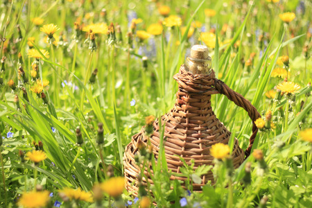 Close composition of two glass Bottle covered with osier