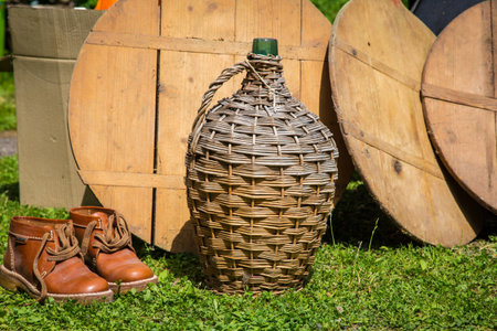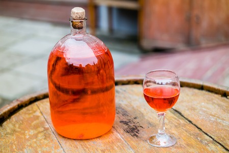 View of a glass bottle and a traditional wooden woven bottle holding several liters. Two empty glasses on the barrel. Small local meditarranean town, local domestic homemade wine