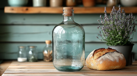 Glass bottle and bread loaf placed on a wooden table with a lavender plant in a kitchen setting. Generative AI