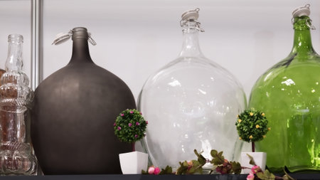 Glass Large Empty Bottles and Flasks for Wine and Alcoholic Beverages in a Store Window are Sold on a Shelf