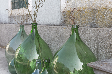 Wine industry of Cyprus island, collection of old wine fermenting glass jugs and bottles for making wine on ancient winery in Troodos mountain range.