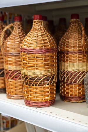 wine carboys bottles enclosed in wickerwork outside at farm