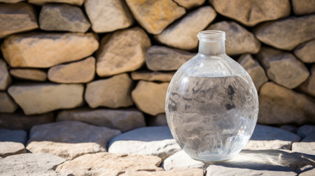 a clear glass bottle with clear liquid in front of a rock wall