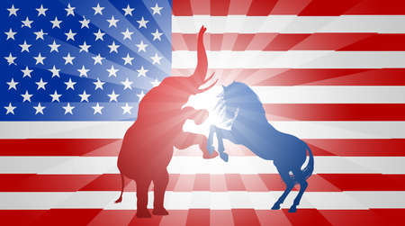 A donkey and elephant fighting in silhouette, with the elephant and donkey rearing up. Mascot animals of American democratic and republican parties, concept for the presidential election or politics in general