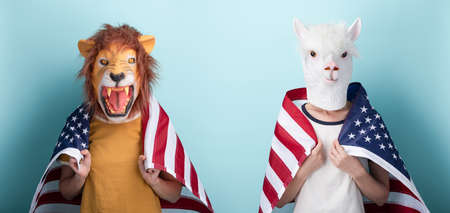 Young woman in lion and alpaca mask hold USA US United States flag wrapped around the shoulders, isolated on blue background