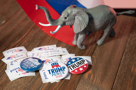 Washington DC--July 4, 2020; Lay flat display of Trump campaign buttons, I voted stickers, a Republican Party elephant standing in front of a Russian flag capturing controversial 2020 election themes