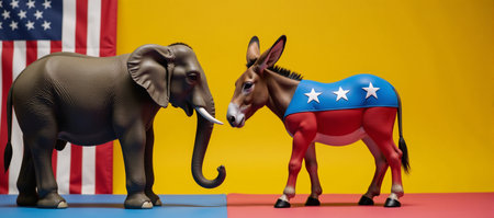 A donkey or jackass and elephant with an American flag design. Mascot animals of American democratic and republican parties, concept for the presidential election debate or politics in general