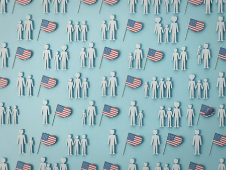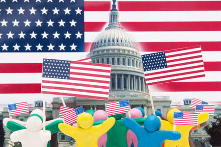 Crowd group of colourful plasticine humans with the USA flags on the white.