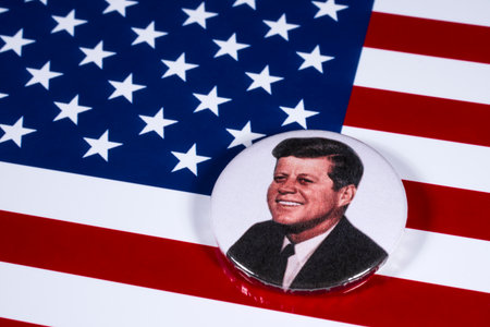 LONDON, UK - APRIL 27TH 2018: A John F. Kennedy badge pictured over the USA Flag, on 27th April 2018. John F Kennedy was the 35th President of the United States of America.