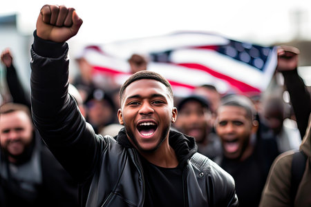 A determined African American man in front of USA flag among the crowd, proud and confident, fighting and protesting with a raised fist against racism, for justice and equality, Black Lives Matter
