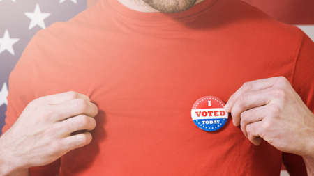 Man putting on I Voted Today button for Presidential election 2020 in America.