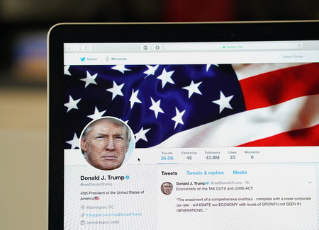 Wuhan China, 2 December 2017: Donald Trump official twitter account website page on a laptop screen