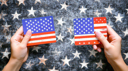 Two hands, one blue and one red, hold cards resembling the American flag, emphasizing contrasting political views amidst a starry backdrop.