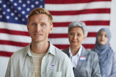 Multi-ethnic group of people at polling station on election day, focus on contemporary man with I VOTED sticker looking at camera, copy space
