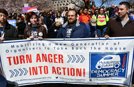 WASHINGTON, DC, USA - MARCH 24, 2018: People hold signs in the March For Our Lives, a student-led rally, demanding an end to gun violence and responsible firearm control legislation.