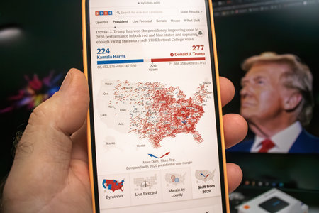 Paris, France - Nov 6, 2024: A smartphone shows the NY Times 2024 election results by county, with Trump leading Harris, displaying detailed voting shifts across the U.S